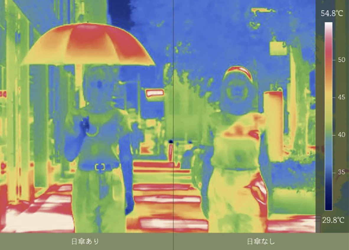 一般的な日傘でも体感温度が2〜7℃下がると言われていますが、日傘ブランドの『untule』では体感温度が最大19℃下がるとも言われていて、炎天下を歩くときの疲れ方がまったく違います。日傘ありの場合と日傘なしの場合のサーモグラフィー画像をご覧いただくと一目瞭然です。